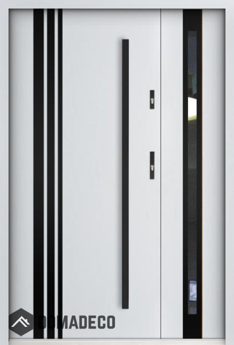 Die Türen bestehen aus Edelstahl. Im Inneren ist es mit PUR-Polyurethanschaum und Holz gefüllt. Die Türblattdicke beträgt 55 mm. Doppeldichtungssystem - Eine Dichtung befindet sich am unteren Rand des Rahmens und die andere im Lagerteil des Türblatts. Sie reduzieren Vibrationen und schützen Ihr Zuhause vor Wärmeverlust. Sie ändern ihre Lautstärke nicht unter dem Einfluss von Wetterbedingungen. Der Türrahmen hat einbruchhemmende Verstärkungen in den Scharnierteilen und Verriegelungspunkten.