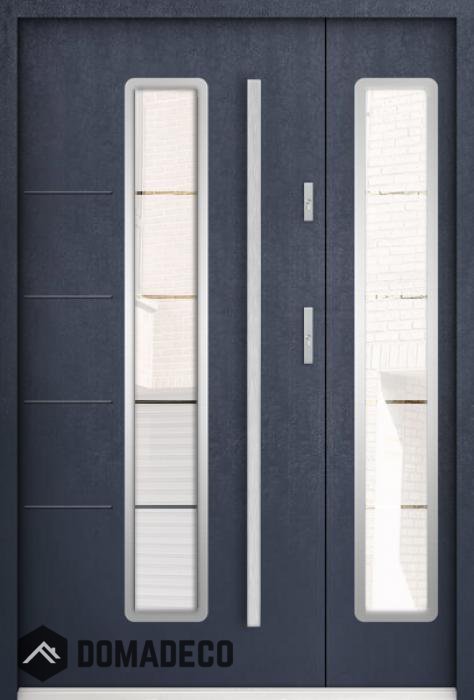 Die Türen bestehen aus Edelstahl. Im Inneren ist es mit PUR-Polyurethanschaum und Holz gefüllt. Die Türblattdicke beträgt 55 mm. Doppeldichtungssystem - Eine Dichtung befindet sich am unteren Rand des Rahmens und die andere im Lagerteil des Türblatts. Sie reduzieren Vibrationen und schützen Ihr Zuhause vor Wärmeverlust. Sie ändern ihre Lautstärke nicht unter dem Einfluss von Wetterbedingungen. Der Türrahmen hat einbruchhemmende Verstärkungen in den Scharnierteilen und Verriegelungspunkten.