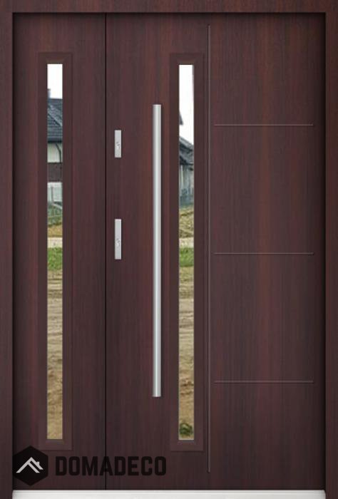 Die Türen bestehen aus Edelstahl. Im Inneren ist es mit PUR-Polyurethanschaum und Holz gefüllt. Die Türblattdicke beträgt 55 mm. Doppeldichtungssystem - Eine Dichtung befindet sich am unteren Rand des Rahmens und die andere im Lagerteil des Türblatts. Sie reduzieren Vibrationen und schützen Ihr Zuhause vor Wärmeverlust. Sie ändern ihre Lautstärke nicht unter dem Einfluss von Wetterbedingungen. Der Türrahmen hat einbruchhemmende Verstärkungen in den Scharnierteilen und Verriegelungspunkten.