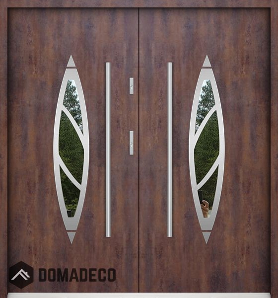 Die Türen bestehen aus Edelstahl. Im Inneren ist es mit PUR-Polyurethanschaum und Holz gefüllt. Die Türblattdicke beträgt 55 mm. Doppeldichtungssystem - Eine Dichtung befindet sich am unteren Rand des Rahmens und die andere im Lagerteil des Türblatts. Sie reduzieren Vibrationen und schützen Ihr Zuhause vor Wärmeverlust. Sie ändern ihre Lautstärke nicht unter dem Einfluss von Wetterbedingungen. Der Türrahmen hat einbruchhemmende Verstärkungen in den Scharnierteilen und Verriegelungspunkten.