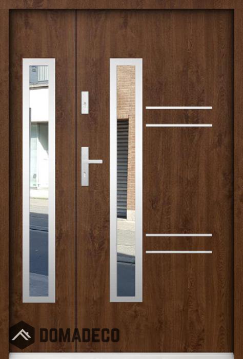 Die Türen bestehen aus Edelstahl. Im Inneren ist es mit PUR-Polyurethanschaum und Holz gefüllt. Die Türblattdicke beträgt 55 mm. Doppeldichtungssystem - Eine Dichtung befindet sich am unteren Rand des Rahmens und die andere im Lagerteil des Türblatts. Sie reduzieren Vibrationen und schützen Ihr Zuhause vor Wärmeverlust. Sie ändern ihre Lautstärke nicht unter dem Einfluss von Wetterbedingungen. Der Türrahmen hat einbruchhemmende Verstärkungen in den Scharnierteilen und Verriegelungspunkten.