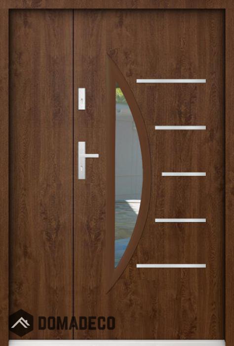 Die Türen bestehen aus Edelstahl. Im Inneren ist es mit PUR-Polyurethanschaum und Holz gefüllt. Die Türblattdicke beträgt 55 mm. Doppeldichtungssystem - Eine Dichtung befindet sich am unteren Rand des Rahmens und die andere im Lagerteil des Türblatts. Sie reduzieren Vibrationen und schützen Ihr Zuhause vor Wärmeverlust. Sie ändern ihre Lautstärke nicht unter dem Einfluss von Wetterbedingungen. Der Türrahmen hat einbruchhemmende Verstärkungen in den Scharnierteilen und Verriegelungspunkten.