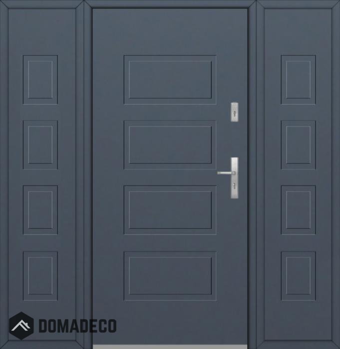 Die Türen bestehen aus Edelstahl. Im Inneren ist es mit PUR-Polyurethanschaum und Holz gefüllt. Die Türblattdicke beträgt 54 mm. Doppeldichtungssystem - Eine Dichtung befindet sich am unteren Rand des Rahmens und die andere im Lagerteil des Türblatts. Sie reduzieren Vibrationen und schützen Ihr Zuhause vor Wärmeverlust. Sie ändern ihre Lautstärke nicht unter dem Einfluss von Wetterbedingungen. Der Türrahmen hat einbruchhemmende Verstärkungen in den Scharnierteilen und Verriegelungspunkten.