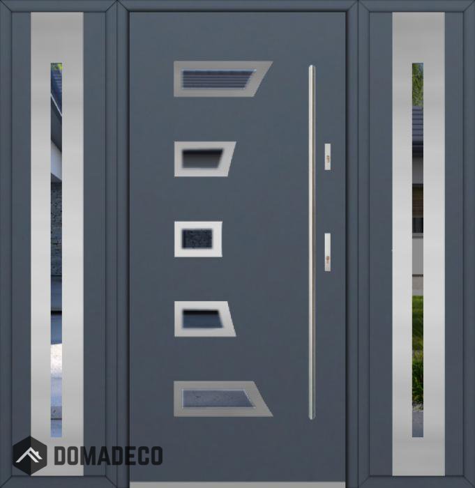 Die Türen bestehen aus Edelstahl. Im Inneren ist es mit PUR-Polyurethanschaum und Holz gefüllt. Die Türblattdicke beträgt 54 mm. Doppeldichtungssystem - Eine Dichtung befindet sich am unteren Rand des Rahmens und die andere im Lagerteil des Türblatts. Sie reduzieren Vibrationen und schützen Ihr Zuhause vor Wärmeverlust. Sie ändern ihre Lautstärke nicht unter dem Einfluss von Wetterbedingungen. Der Türrahmen hat einbruchhemmende Verstärkungen in den Scharnierteilen und Verriegelungspunkten.