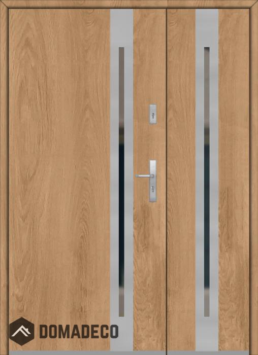 Die Türen bestehen aus Edelstahl. Im Inneren ist es mit PUR-Polyurethanschaum und Holz gefüllt. Die Türblattdicke beträgt 54 mm. Doppeldichtungssystem - Eine Dichtung befindet sich am unteren Rand des Rahmens und die andere im Lagerteil des Türblatts. Sie reduzieren Vibrationen und schützen Ihr Zuhause vor Wärmeverlust. Sie ändern ihre Lautstärke nicht unter dem Einfluss von Wetterbedingungen. Der Türrahmen hat einbruchhemmende Verstärkungen in den Scharnierteilen und Verriegelungspunkten.