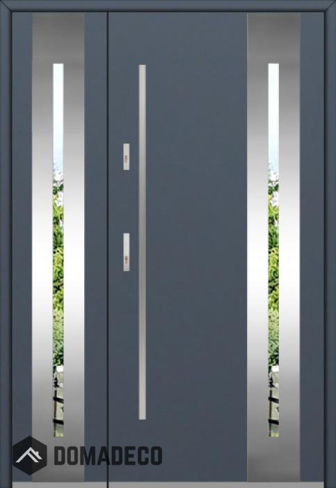 Die Türen bestehen aus Edelstahl. Im Inneren ist es mit PUR-Polyurethanschaum und Holz gefüllt. Die Türblattdicke beträgt 54 mm. Doppeldichtungssystem - Eine Dichtung befindet sich am unteren Rand des Rahmens und die andere im Lagerteil des Türblatts. Sie reduzieren Vibrationen und schützen Ihr Zuhause vor Wärmeverlust. Sie ändern ihre Lautstärke nicht unter dem Einfluss von Wetterbedingungen. Der Türrahmen hat einbruchhemmende Verstärkungen in den Scharnierteilen und Verriegelungspunkten.