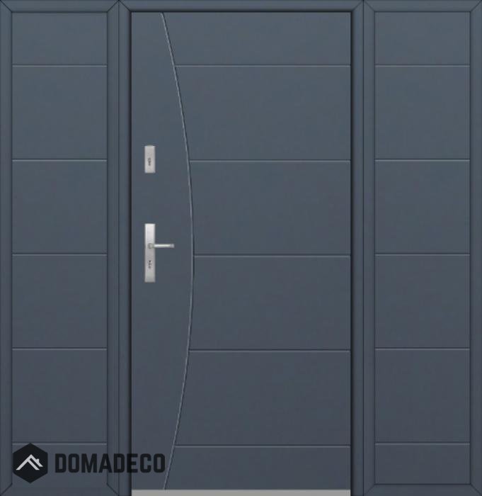 Die Türen bestehen aus Edelstahl. Im Inneren ist es mit PUR-Polyurethanschaum und Holz gefüllt. Die Türblattdicke beträgt 54 mm. Doppeldichtungssystem - Eine Dichtung befindet sich am unteren Rand des Rahmens und die andere im Lagerteil des Türblatts. Sie reduzieren Vibrationen und schützen Ihr Zuhause vor Wärmeverlust. Sie ändern ihre Lautstärke nicht unter dem Einfluss von Wetterbedingungen. Der Türrahmen hat einbruchhemmende Verstärkungen in den Scharnierteilen und Verriegelungspunkten.
