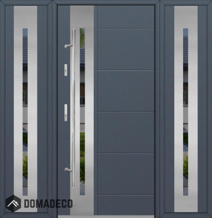 Die Türen bestehen aus Edelstahl. Im Inneren ist es mit PUR-Polyurethanschaum und Holz gefüllt. Die Türblattdicke beträgt 54 mm. Doppeldichtungssystem - Eine Dichtung befindet sich am unteren Rand des Rahmens und die andere im Lagerteil des Türblatts. Sie reduzieren Vibrationen und schützen Ihr Zuhause vor Wärmeverlust. Sie ändern ihre Lautstärke nicht unter dem Einfluss von Wetterbedingungen. Der Türrahmen hat einbruchhemmende Verstärkungen in den Scharnierteilen und Verriegelungspunkten.