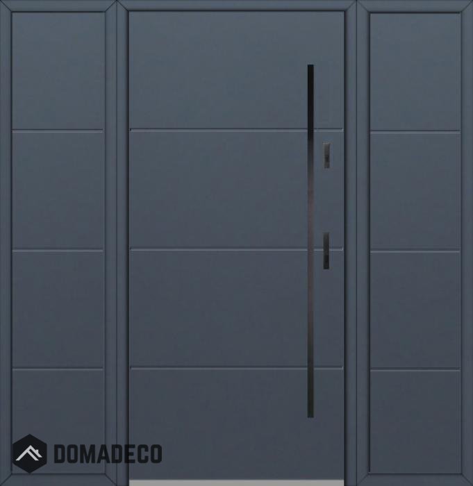 Die Türen bestehen aus Edelstahl. Im Inneren ist es mit PUR-Polyurethanschaum und Holz gefüllt. Die Türblattdicke beträgt 54 mm. Doppeldichtungssystem - Eine Dichtung befindet sich am unteren Rand des Rahmens und die andere im Lagerteil des Türblatts. Sie reduzieren Vibrationen und schützen Ihr Zuhause vor Wärmeverlust. Sie ändern ihre Lautstärke nicht unter dem Einfluss von Wetterbedingungen. Der Türrahmen hat einbruchhemmende Verstärkungen in den Scharnierteilen und Verriegelungspunkten.