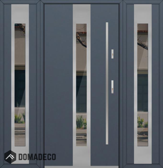 Die Türen bestehen aus Edelstahl. Im Inneren ist es mit PUR-Polyurethanschaum und Holz gefüllt. Die Türblattdicke beträgt 54 mm. Doppeldichtungssystem - Eine Dichtung befindet sich am unteren Rand des Rahmens und die andere im Lagerteil des Türblatts. Sie reduzieren Vibrationen und schützen Ihr Zuhause vor Wärmeverlust. Sie ändern ihre Lautstärke nicht unter dem Einfluss von Wetterbedingungen. Der Türrahmen hat einbruchhemmende Verstärkungen in den Scharnierteilen und Verriegelungspunkten.