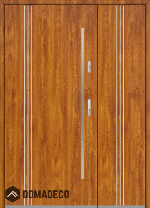 Die Türen bestehen aus Edelstahl. Im Inneren ist es mit PUR-Polyurethanschaum und Holz gefüllt. Die Türblattdicke beträgt 54 mm. Doppeldichtungssystem - Eine Dichtung befindet sich am unteren Rand des Rahmens und die andere im Lagerteil des Türblatts. Sie reduzieren Vibrationen und schützen Ihr Zuhause vor Wärmeverlust. Sie ändern ihre Lautstärke nicht unter dem Einfluss von Wetterbedingungen. Der Türrahmen hat einbruchhemmende Verstärkungen in den Scharnierteilen und Verriegelungspunkten.
