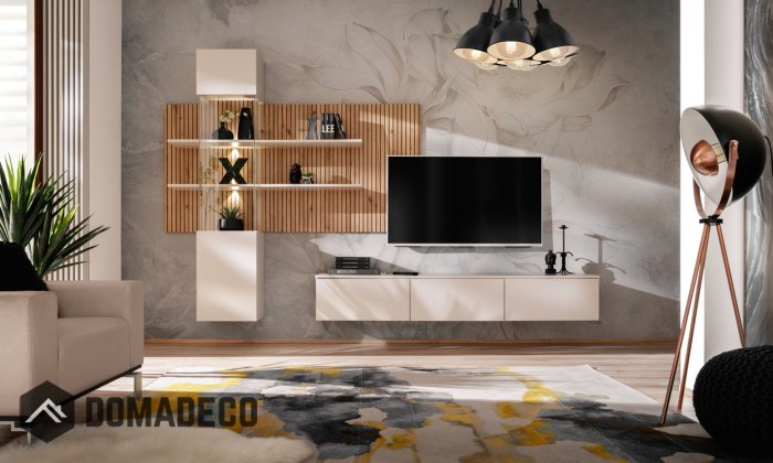 Dekorative Paneele – gerillt, mit schwarzen Einsätzen (Druck imitiert Lamellen), was dem Ganzen einen modernen 3D-Paneeleffekt verleiht.