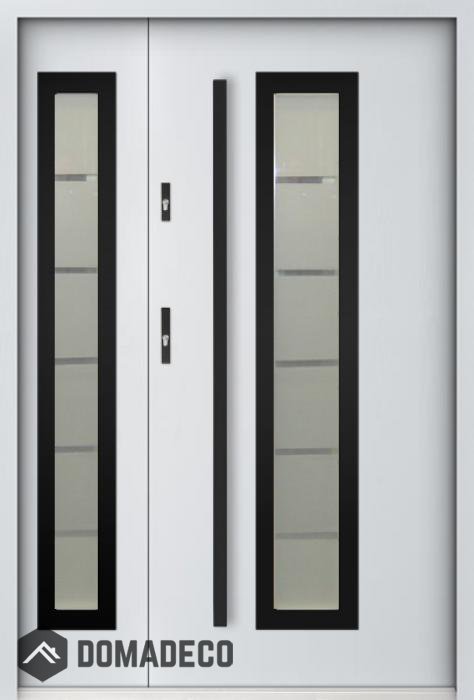 Die Türen bestehen aus Edelstahl. Im Inneren ist es mit PUR-Polyurethanschaum und Holz gefüllt. Die Türblattdicke beträgt 55 mm. Doppeldichtungssystem - Eine Dichtung befindet sich am unteren Rand des Rahmens und die andere im Lagerteil des Türblatts. Sie reduzieren Vibrationen und schützen Ihr Zuhause vor Wärmeverlust. Sie ändern ihre Lautstärke nicht unter dem Einfluss von Wetterbedingungen. Der Türrahmen hat einbruchhemmende Verstärkungen in den Scharnierteilen und Verriegelungspunkten.