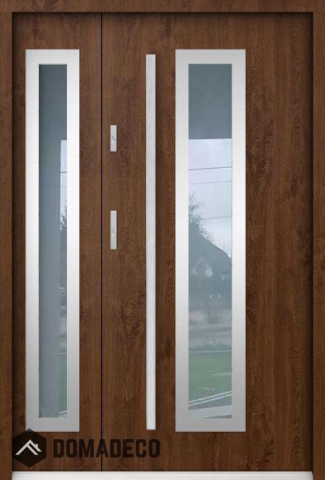 Die Türen bestehen aus Edelstahl. Im Inneren ist es mit PUR-Polyurethanschaum und Holz gefüllt. Die Türblattdicke beträgt 55 mm. Doppeldichtungssystem - Eine Dichtung befindet sich am unteren Rand des Rahmens und die andere im Lagerteil des Türblatts. Sie reduzieren Vibrationen und schützen Ihr Zuhause vor Wärmeverlust. Sie ändern ihre Lautstärke nicht unter dem Einfluss von Wetterbedingungen. Der Türrahmen hat einbruchhemmende Verstärkungen in den Scharnierteilen und Verriegelungspunkten.