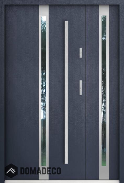 Die Türen bestehen aus Edelstahl. Im Inneren ist es mit PUR-Polyurethanschaum und Holz gefüllt. Die Türblattdicke beträgt 55 mm. Doppeldichtungssystem - Eine Dichtung befindet sich am unteren Rand des Rahmens und die andere im Lagerteil des Türblatts. Sie reduzieren Vibrationen und schützen Ihr Zuhause vor Wärmeverlust. Sie ändern ihre Lautstärke nicht unter dem Einfluss von Wetterbedingungen. Der Türrahmen hat einbruchhemmende Verstärkungen in den Scharnierteilen und Verriegelungspunkten.