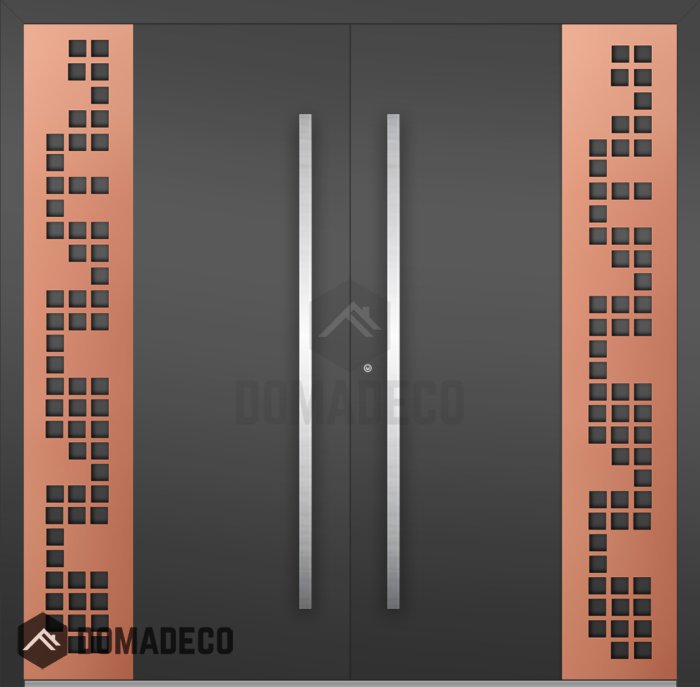 LIM C27 doppelt – Aluminium-Eingangstür mit Kupferblechverkleidung und ausgeschnittenen Quadraten
