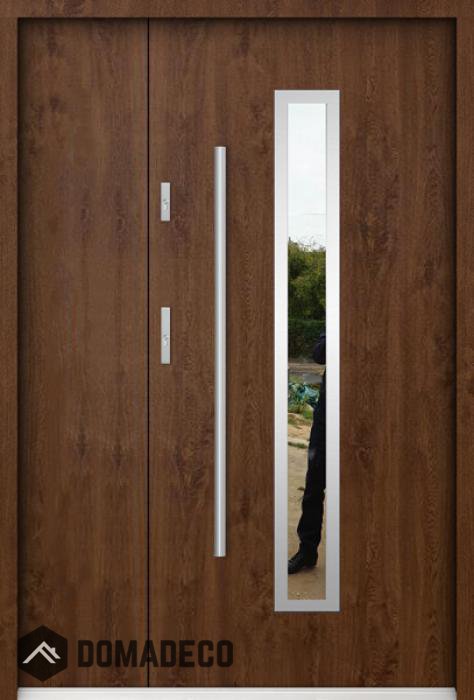 Die Türen bestehen aus Edelstahl. Im Inneren ist es mit PUR-Polyurethanschaum und Holz gefüllt. Die Türblattdicke beträgt 55 mm. Doppeldichtungssystem - Eine Dichtung befindet sich am unteren Rand des Rahmens und die andere im Lagerteil des Türblatts. Sie reduzieren Vibrationen und schützen Ihr Zuhause vor Wärmeverlust. Sie ändern ihre Lautstärke nicht unter dem Einfluss von Wetterbedingungen. Der Türrahmen hat einbruchhemmende Verstärkungen in den Scharnierteilen und Verriegelungspunkten.