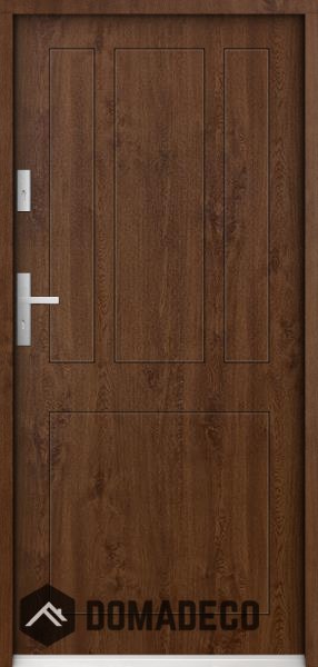 Die Türen bestehen aus Edelstahl. Im Inneren ist es mit PUR-Polyurethanschaum und Holz gefüllt. Die Türblattdicke beträgt 55 mm. Doppeldichtungssystem - Eine Dichtung befindet sich am unteren Rand des Rahmens und die andere im Lagerteil des Türblatts. Sie reduzieren Vibrationen und schützen Ihr Zuhause vor Wärmeverlust. Sie ändern ihre Lautstärke nicht unter dem Einfluss von Wetterbedingungen. Der Türrahmen hat einbruchhemmende Verstärkungen in den Scharnierteilen und Verriegelungspunkten.