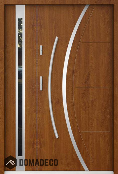 Die Türen bestehen aus Edelstahl. Im Inneren ist es mit PUR-Polyurethanschaum und Holz gefüllt. Die Türblattdicke beträgt 55 mm. Doppeldichtungssystem - Eine Dichtung befindet sich am unteren Rand des Rahmens und die andere im Lagerteil des Türblatts. Sie reduzieren Vibrationen und schützen Ihr Zuhause vor Wärmeverlust. Sie ändern ihre Lautstärke nicht unter dem Einfluss von Wetterbedingungen. Der Türrahmen hat einbruchhemmende Verstärkungen in den Scharnierteilen und Verriegelungspunkten.