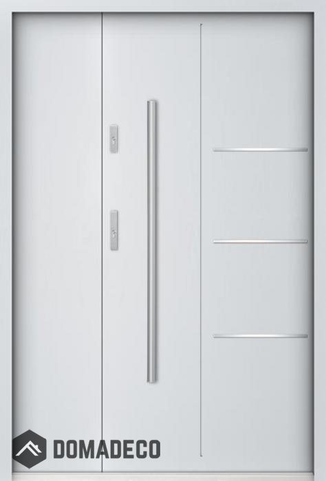 Die Türen bestehen aus Edelstahl. Im Inneren ist es mit PUR-Polyurethanschaum und Holz gefüllt. Die Türblattdicke beträgt 55 mm. Doppeldichtungssystem - Eine Dichtung befindet sich am unteren Rand des Rahmens und die andere im Lagerteil des Türblatts. Sie reduzieren Vibrationen und schützen Ihr Zuhause vor Wärmeverlust. Sie ändern ihre Lautstärke nicht unter dem Einfluss von Wetterbedingungen. Der Türrahmen hat einbruchhemmende Verstärkungen in den Scharnierteilen und Verriegelungspunkten.