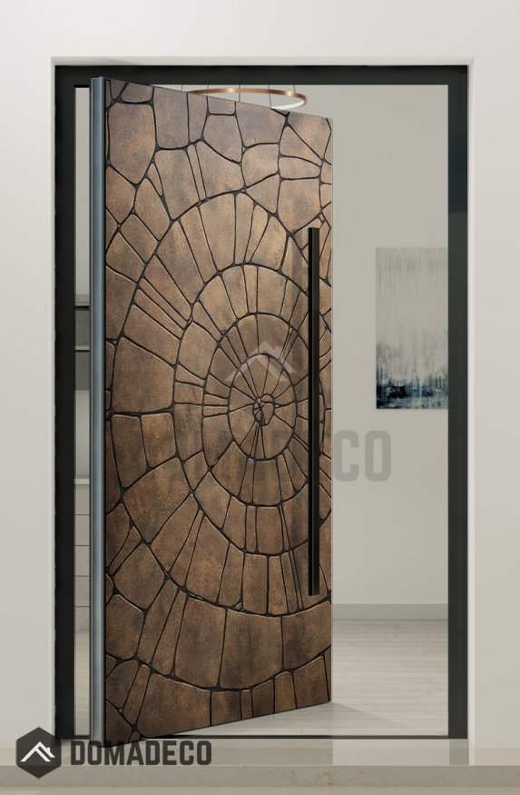 PIVOT M30 – Aluminium-Drehtür mit brauner Struktur aus gefrästem Metall