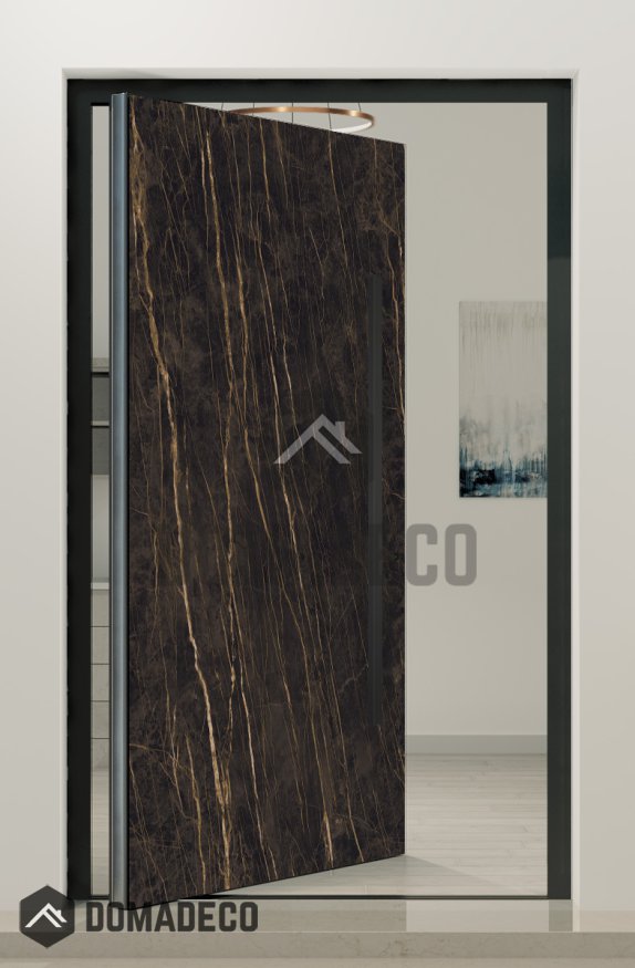PIVOT V54 - Aluminium-Drehtür mit gesintertem Quarz Noir Desir verkleidet
