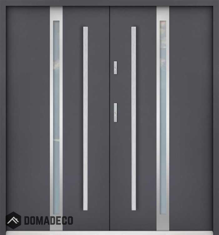 Die Türen bestehen aus Edelstahl. Im Inneren ist es mit PUR-Polyurethanschaum und Holz gefüllt. Die Türblattdicke beträgt 55 mm. Doppeldichtungssystem - Eine Dichtung befindet sich am unteren Rand des Rahmens und die andere im Lagerteil des Türblatts. Sie reduzieren Vibrationen und schützen Ihr Zuhause vor Wärmeverlust. Sie ändern ihre Lautstärke nicht unter dem Einfluss von Wetterbedingungen. Der Türrahmen hat einbruchhemmende Verstärkungen in den Scharnierteilen und Verriegelungspunkten.