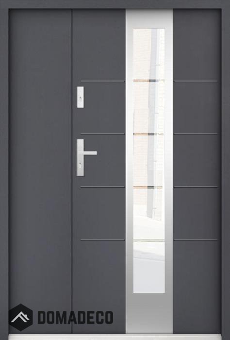 Die Türen bestehen aus Edelstahl. Im Inneren ist es mit PUR-Polyurethanschaum und Holz gefüllt. Die Türblattdicke beträgt 55 mm. Doppeldichtungssystem - Eine Dichtung befindet sich am unteren Rand des Rahmens und die andere im Lagerteil des Türblatts. Sie reduzieren Vibrationen und schützen Ihr Zuhause vor Wärmeverlust. Sie ändern ihre Lautstärke nicht unter dem Einfluss von Wetterbedingungen. Der Türrahmen hat einbruchhemmende Verstärkungen in den Scharnierteilen und Verriegelungspunkten.